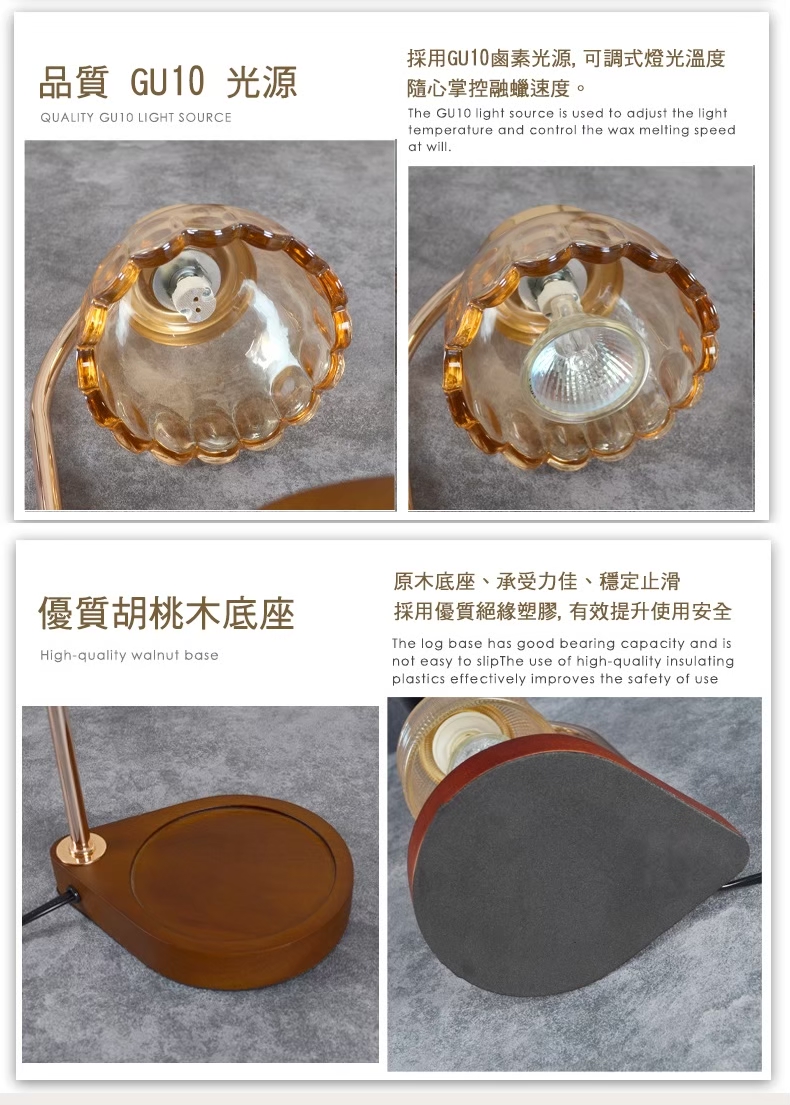 1. 不需要點火:使用燈罩裡的鹵素燈,暖暖的烘著香氛蠟蠋,香氣因著融化的燭油慢慢飄散在空中。