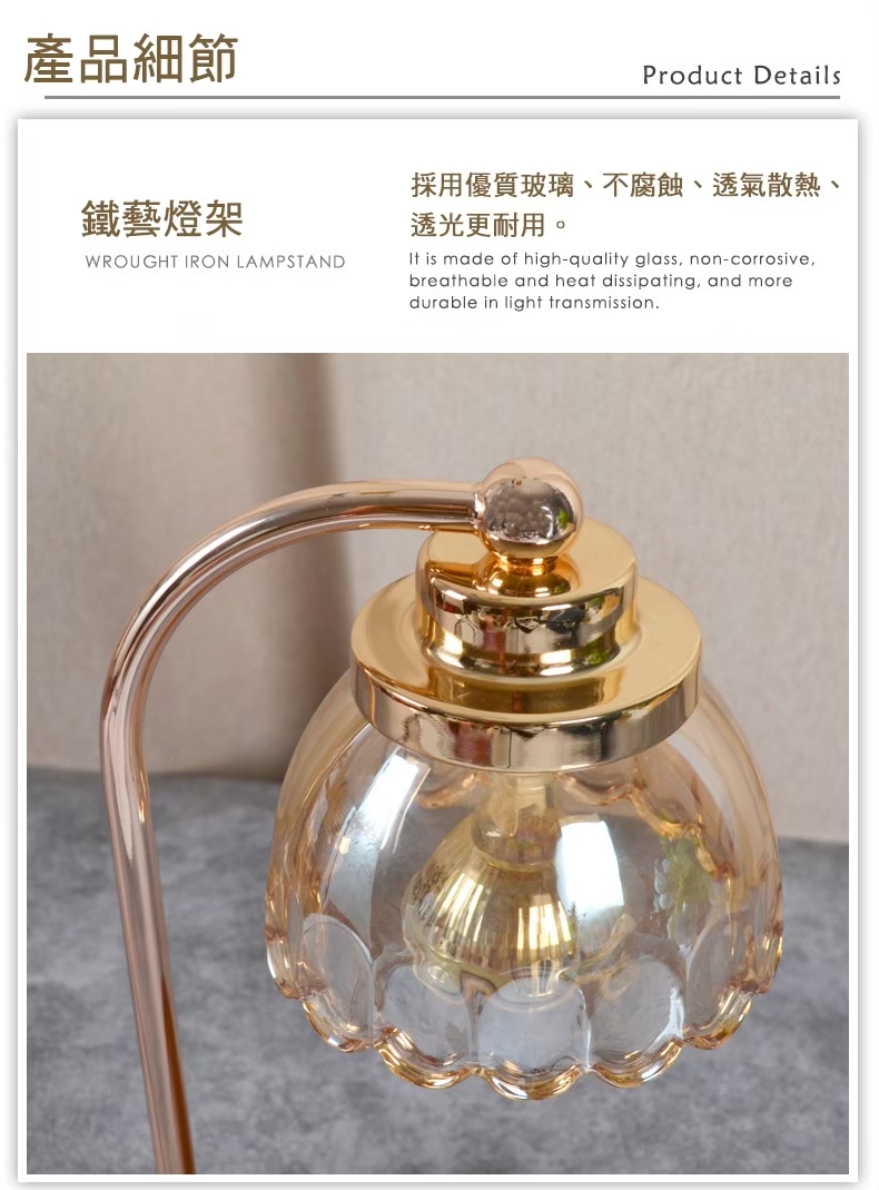 大多數的蠟燭燈的燈罩還是採用金屬材質,原因其實很簡單,因為鹵素燈會發熱,金屬材質的散熱效果較好,可以使用到50W的燈泡,一般市售的蠟燭都可以很快速且順利地融化。而金屬的融蠟燈的燈罩也比較不會變形,相較之下會比較耐用。缺點是如果燈泡開到最亮一陣子,就能感受到燈罩有點燙燙的,再久一點有可能會燙手。這時候就再次推薦我們低溫融化的大豆蠟,不需要開到最亮,燈罩只會微熱不燙手喔!